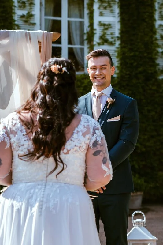 Le first look, littéralement "premier regard", c’est ce moment où les mariés se voient pour la toute première fois avant la cérémonie. Pas sur fond d’orgue, pas au bout de l’allée… mais dans un cadre plus intime, souvent choisi avec soin. Un endroit où vous pouvez vous dire "wow" sans 100 paires d’yeux braquées sur vous.